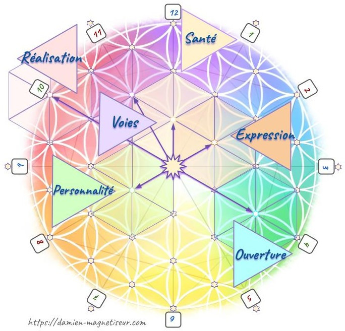 🟪 Élaboré sur la carte énergétique de la Connaissance de Soi, votre thème est défini en 12 Rayons représentant 12 domaines de votre existence.
